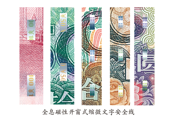 人民幣從第四套1990年版開始運(yùn)用安全線這項(xiàng)防偽技術(shù),1990年版50元、100元,使用普通全埋式安全線。第五套1999年版的安全線,開始加印縮微文字和全息文字。100元、50元為磁性縮微文字安全線,20元為磁性間斷式安全線(無字),10元和5元首次使用全息磁性開窗式安全線。安全線的植入方式由全埋式改為開窗式,所謂開窗,是指線體材料等距間斷埋入紙中和裸露在紙表面;材料由單一的聚酯材料改為有閃光效果的復(fù)合材料。