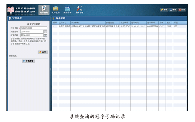 通過(guò)記錄、存儲(chǔ)、備查銀行業(yè)金融機(jī)構(gòu)對(duì)外付出人民幣冠字號(hào)碼(100元券和50元券),可以解決銀行涉假幣糾紛的舉證和責(zé)任認(rèn)定問(wèn)題,維護(hù)金融消費(fèi)者權(quán)益。金融消費(fèi)者在銀行辦理現(xiàn)金取款業(yè)務(wù)后,對(duì)現(xiàn)金真?zhèn)未嬖诋愖h,經(jīng)銀行進(jìn)行真?zhèn)巫R(shí)別確認(rèn)是假幣的,假幣將會(huì)被銀行收繳。金融消費(fèi)者可以憑借收繳憑證向銀行提起冠字號(hào)碼查詢申請(qǐng),由銀行查證,如果該假幣由銀行付出,金融消費(fèi)者將得到全額賠償。