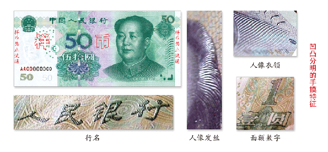 人民幣正背票面中的國(guó)徽、行名、中文面額數(shù)字、光變油墨面額數(shù)字、盲文標(biāo)記等均為雕刻凹印圖案。上述圖文具有獨(dú)特的浮雕式的凹凸效果,可以通過手指檢查其觸感特征。